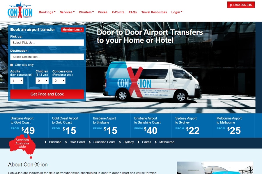 ブリスベン空港の国際線ターミナル到着ロビー内と国内線ターミナル到着ロビー外のブースにコネクション・エアポート・トランスファー(Con-X-ion Airport Transfer)の受付カウンターがあります。
